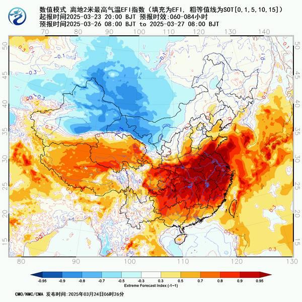 △26日最高氣温EFI指數預報圖,越紅的區域表明出現極端最高氣温的概率越大。