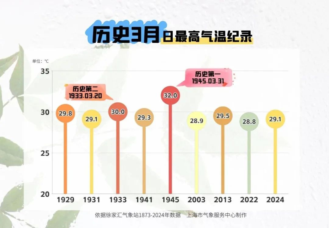 常年平均來看,**上海首個30℃+的日子通常在4月底5月初。**3月就出現的情況並不多見。徐家彙氣象觀測站150多年曆史中,僅1933年3月20日和1945年3月31日這兩天達到或超過,明後天或創1933年以後最早30℃氣温紀錄!
