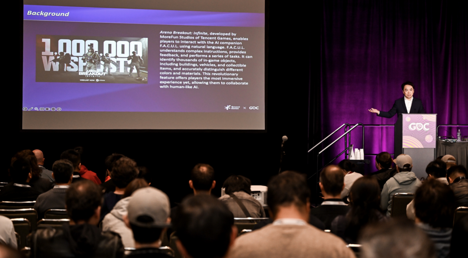 騰訊遊戲魔方工作室分享了《F.A.C.U.L:首個懂人類語言的 FPS AI 隊友》議題,項目融合語音輸入、大語言模型、即時文本轉語音等生成式AI技術,讓玩家能與AI隊友沉浸式協同作戰。騰訊遊戲魔方工作室AI項目負責人廖詩颺介紹,《暗區突圍》打破了傳統FPS遊戲中玩家只能通過快捷熱鍵向AI下達簡單指令的限制,使AI隊友能理解複雜指令,還可以識別遊戲中的數千種物體,包括建築、載具和可收集物品,從而革新遊戲體驗。