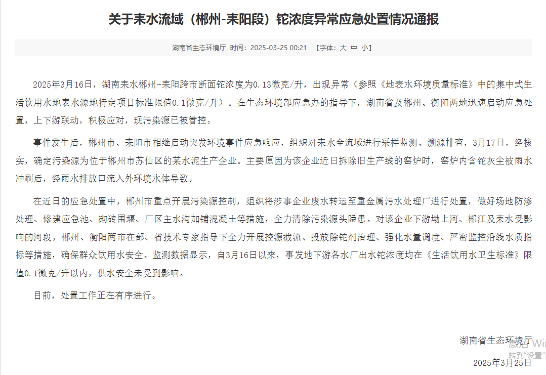 2025年3月16日,湖南耒水郴州-耒陽跨市斷面鉈濃度為0.13微克/升,出現異常(參照《地表水環境質量標準》中的集中式生活飲用水地表水源地特定項目標準限值0.1微克/升)。在生態環境部應急辦的指導下,湖南省及郴州、衡陽兩地迅速啓動應急處置,上下游聯動,積極應對,現污染源已被管控。