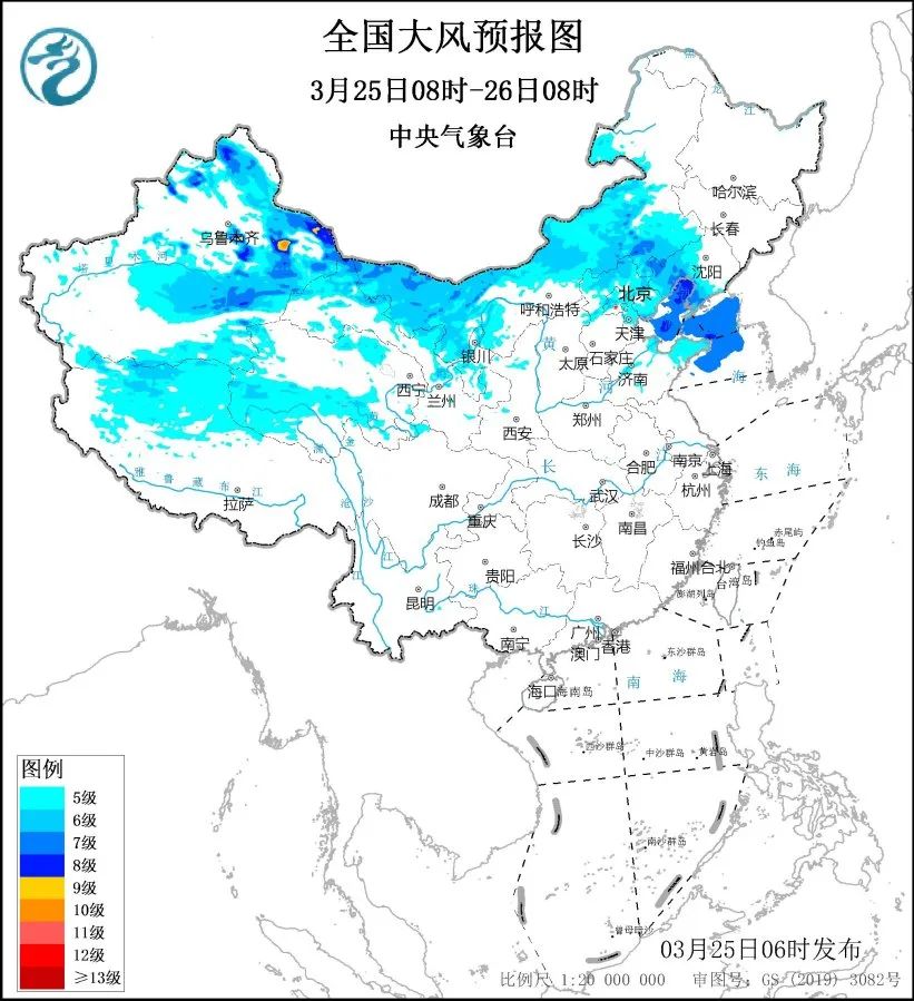 中央氣象台3月25日6時繼續發佈大風藍色預警:預計25日8時至26日8時——