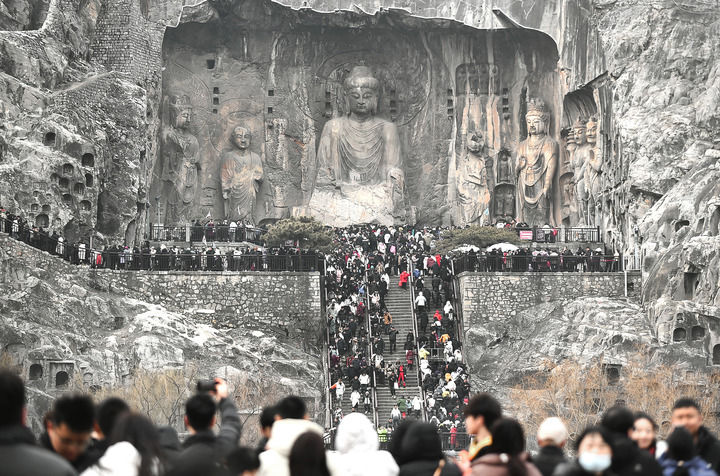 春色正酣。河南洛陽伊水岸畔,龍門石窟遊人如織。