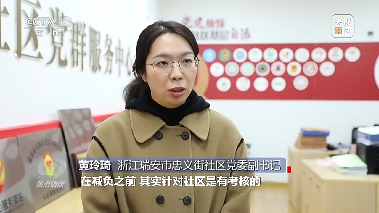 *浙江瑞安市忠義街社區黨委副書記 黃玲琦:*在減負之前,其實針對社區是有考核的,規定我們每個月要開展八場活動,不可能一整個月都在那裏辦活動不開展日常服務,我只能是有一些活動拿過來湊。要想考核好,只能圍繞着考核細則轉,沒辦法。