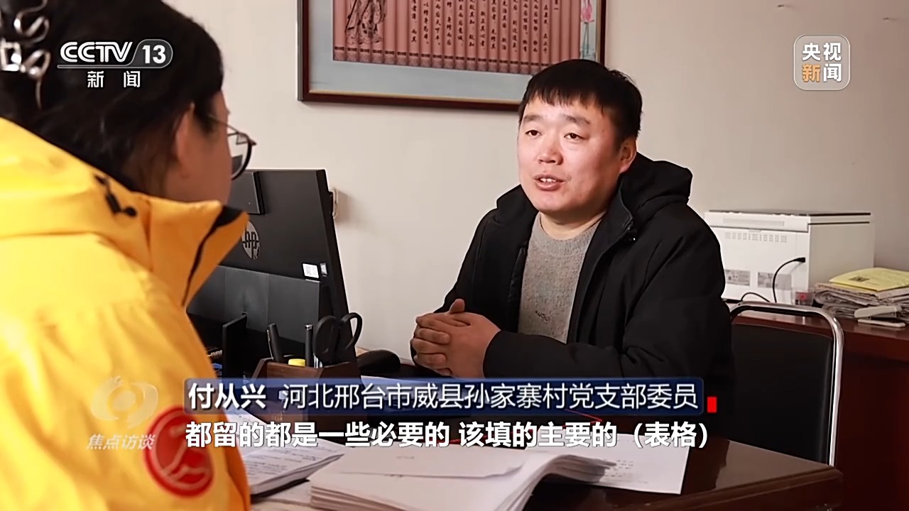 *河北邢台市威縣孫家寨村黨支部委員 付從興:*現在各個部門表格減少了,都留的都是一些必要的、該填的主要的表格,我感覺這樣很好,很精簡,入户有更多精力去給人家探索這些事情,人家家裏確實發生什麼困難,有多少收入,咱們的政策怎麼能幫助人家。