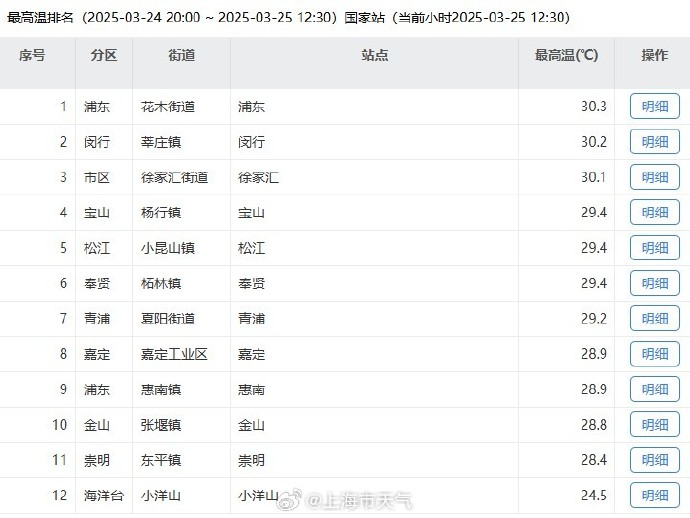 @上海市天氣微博3月25日12時35分發布消息,徐家彙站氣温已衝破30℃,成為1933年以來最早出現30℃氣温的一年,目前位列歷史3月日最高氣温第二位!浦東、閔行也超過30℃,而且還在繼續上升中……