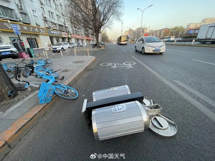 網友發佈的圖片顯示,北京多地有樹木被吹倒,共享單車被吹得東倒西歪,垃圾桶也被吹跑了↓↓