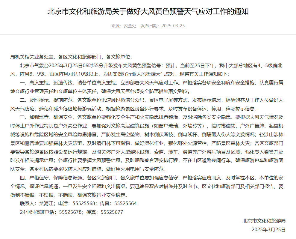 北京市文化和旅遊局發佈《關於做好大風黃色預警天氣應對工作的通知》,通知要求,各區文旅部門要督導各旅遊景區按照設備運行規定,及時關停户外大型遊樂設施、索道、纜車、滑道等户外遊樂項目及區域。