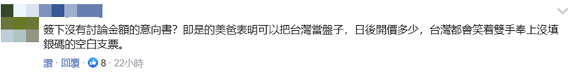還島內網友對此批評稱,“簽下沒有討論金額的意向書?‘美爸’表明可以把台灣當‘盤子(冤大頭)’,日後開價多少,台灣都會笑着雙手奉上沒填銀碼的空白支票”。