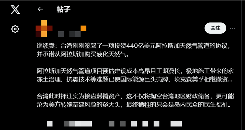 一些島內網友仍對此不買賬,有網友在社交平台X上發文稱,美國曾經想強賣給日本,結果日本沒接盤,賴清德跳出來當接盤俠,此舉為民進黨當局繼續“賣台”的表現,“繼續賣:台灣剛剛簽署了一項投資440億美元阿拉斯加天然氣管道的協議,並承諾從阿拉斯加購買液化天然氣。阿拉斯加天然氣管道項目預估建設成本高昂且工期漫長,極地施工也帶來永凍土治理、抗震技術等難題。台灣此時押注實為接盤滯銷資產,這不僅將掏空台灣地區財政儲備,更可能淪為美方轉嫁基建風險的冤大頭,最終犧牲的只會是島內民眾的民生福祉。”