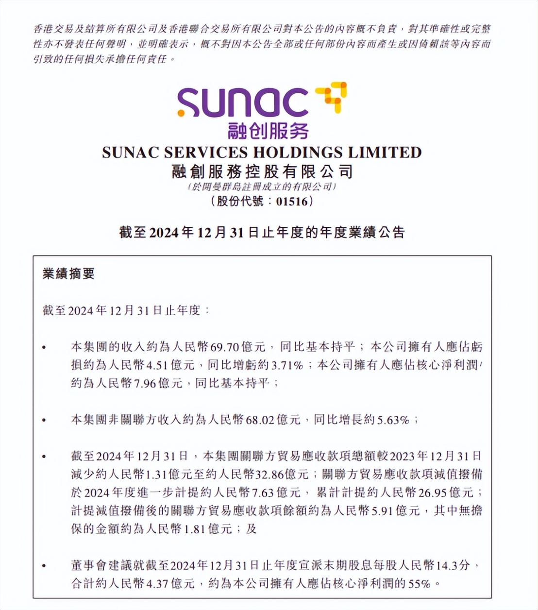 融創服2024年業績:收入約69.7億元,分紅4.4億