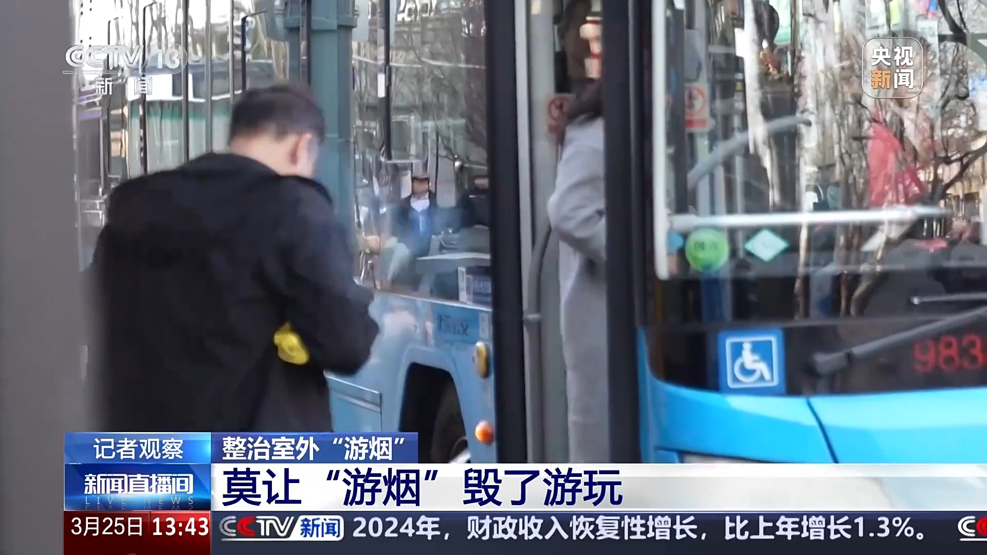 在北京東城區簋街附近一處公交車站,記者記錄下這樣一幕,一位乘客在公交車站台抽煙,直到車輛進站開門,這位乘客在踏上車輛後才將煙頭丟在車下,“遊煙”跟隨其一起進入車廂,公共交通文明引導員專門去把地上的煙頭踩滅,避免消防隱患。