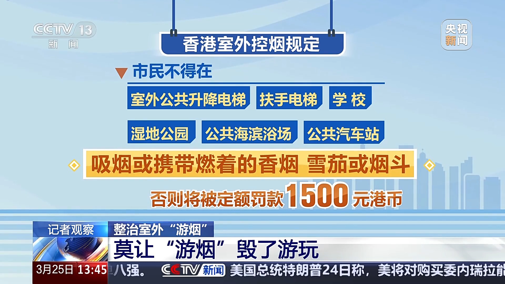 中國疾病預防控制中心控煙辦公室原主任姜垣舉例表示,我國香港、澳門特區禁煙工作持續開展,形成了社會的廣泛共識。比如在香港,要求市民不得在室外公共升降電梯、扶手電梯、學校、濕地公園、公共海濱浴場、公共汽車站吸煙或攜帶燃着的香煙、雪茄或煙斗,否則將被定額罰款港幣1500元。澳門明確公交車站和的士站10米範圍內禁止吸煙,公共場所抽煙最高罰款1500澳門元,煙頭丟地上罰款600澳門元。