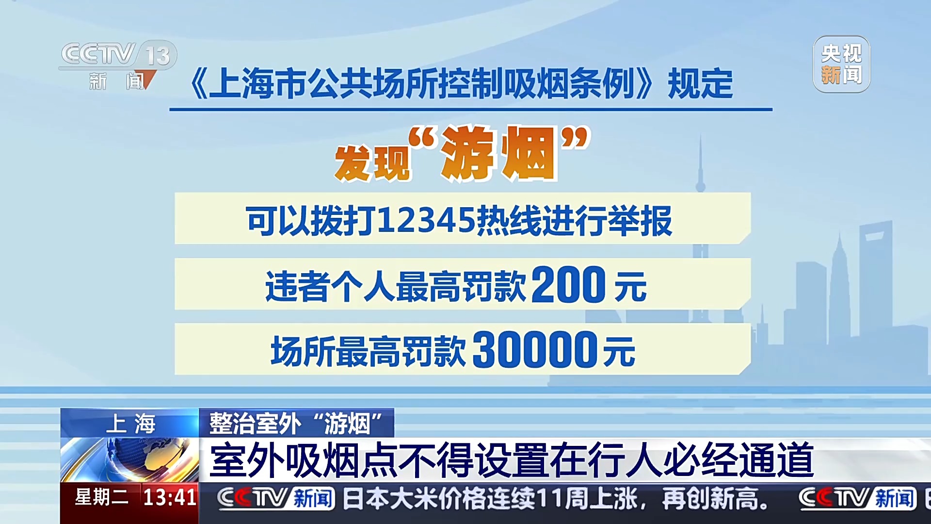 採訪中記者瞭解到,對於二手煙存在的健康風險,不少市民遊客建議通過行政處罰等手段,加強對“遊煙”的處罰。那麼室外的“遊煙”行為,究竟能不能處罰呢?記者查詢發現,按照《上海市公共場所控制吸煙條例》規定,目前市民遊客在幼兒園、中小學校、少年宮、醫院、體育場館、演出場地、文物保護單位,還有人羣聚集的公共交通工具等候區域等公共場所,發現“遊煙”,可以撥打12345熱線進行舉報,違者個人最高罰款200元,場所最高罰款30000元。