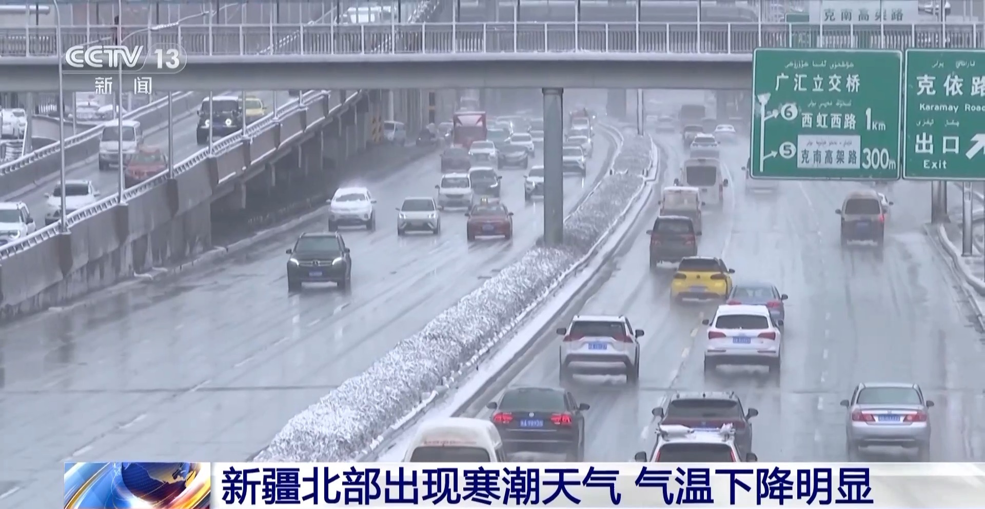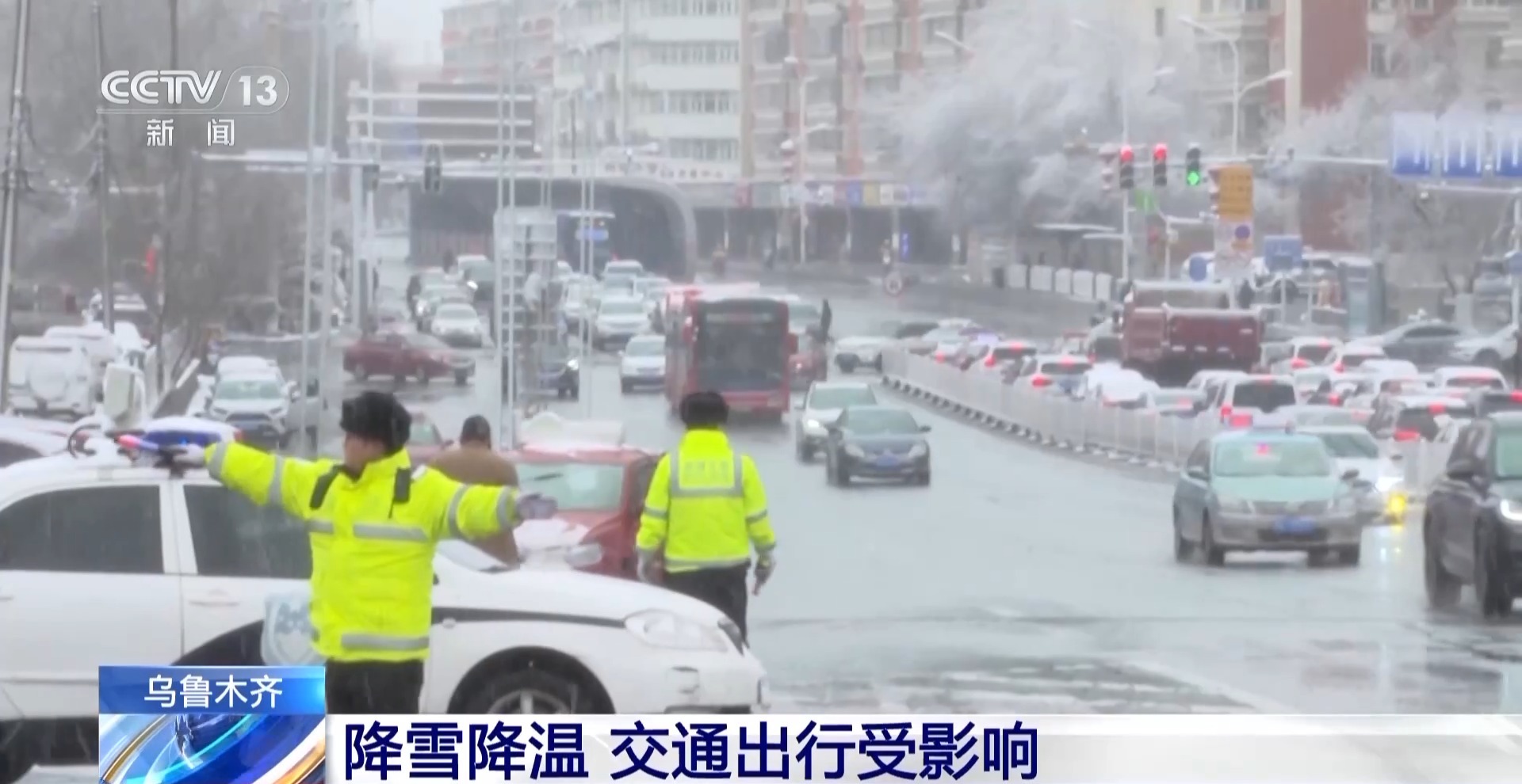 *總枱記者 高鵬飛:*從今天凌晨開始,烏魯木齊出現雨夾雪轉雪的天氣,降温幅度很明顯。降雪和降温使得城市道路非常濕滑,今天早高峯,烏魯木齊多條道路出現擁堵情況,可以看到這場降雪對出行造成了不小的影響。