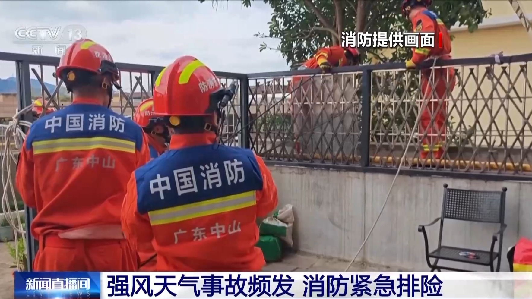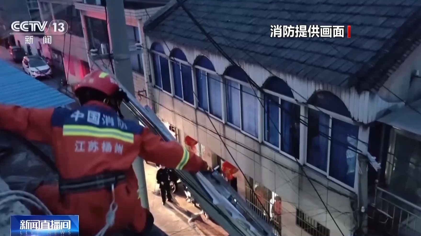 在江蘇揚州,一高層樓頂堆放的太陽能板、鐵皮等雜物被強風吹散至樓頂邊緣,部分鐵皮被吹落,懸掛於電線之間,隨時有墜落危險。消防救援人員到場後,立即利用爬梯向上攀爬,將墜落的鐵皮取回並進行加固。