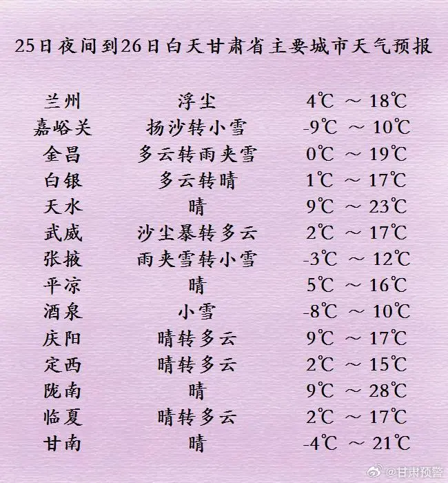 明天夜間到後天白天(03月26日20時-03月27日20時),全省各地多雲,張掖、武威、白銀、蘭州、定西、平涼、慶陽等市部分地方陰有小雪或雨夾雪,祁連山區有中雪。另外,武威、白銀、甘南、天水、平涼、慶陽等市州及蘭州北部、臨夏北部、定西東部有4-5級西北風,酒泉市有4-5級偏東風,上述地區局部地方有揚沙或浮塵。