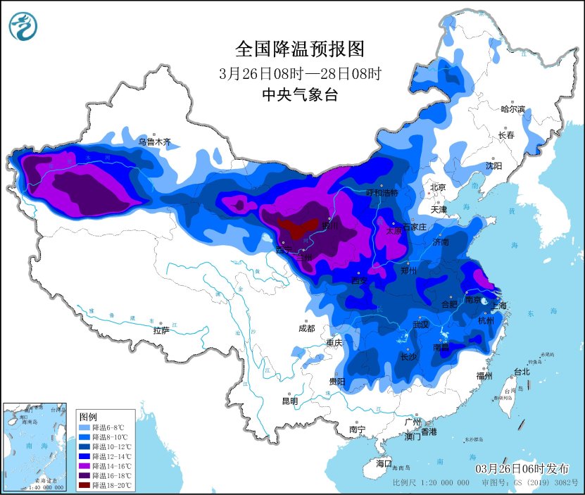預計,3月26日08時至28日08時,新疆南疆盆地、內蒙古中西部、西北地區北部和東部、華北西部、黃淮、江淮、江漢、江南以及四川東北部、貴州東部等地將降温8~10℃,其中,新疆南疆盆地、內蒙古中西部、西北地區北部和東部、華北西部、黃淮西部、江淮東部等地部分地區降温可達12~16℃,局地超過18℃。