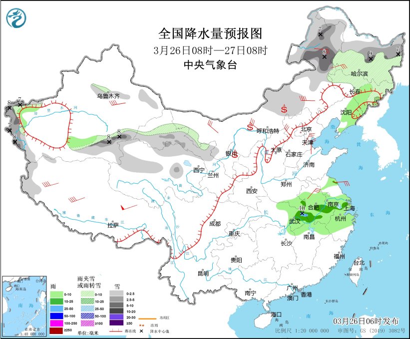 *3月26日08時至27日08時,*新疆南疆盆地東南部和西部山區、甘肅中北部、青海北部、內蒙古東部、東北地區中北部等地部分地區有小到中雪或雨夾雪,其中,新疆南疆盆地東南部和西部山區、內蒙古東北部、黑龍江中部等地部分地區有大雪(5~9毫米)。新疆南疆盆地西部和東南部、吉林中部、遼寧中東部、河南南部、湖北東部、江西北部、安徽大部、浙江中北部、江蘇南部和西北部等地部分地區有小到中雨,其中,安徽西南部、湖北東部等地局地有大雨(25~40毫米)。新疆北疆東部和南疆盆地、西藏中北部、青海大部、內蒙古大部、甘肅北部和東部、寧夏大部、陝西北部、河北北部、遼寧西部、山東半島、四川東北部、雲南東部等地有5~6級風、陣風7~8級;東海西部海域有7級、陣風8級的西南風(見圖3)。
