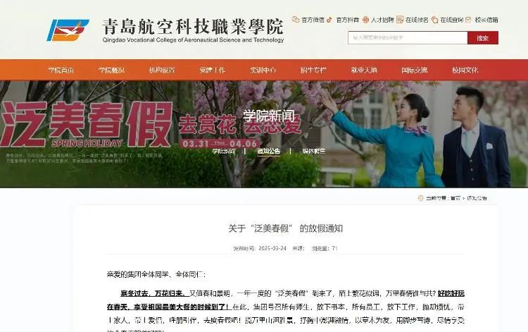 3月24日,青島航空科技職業學院官網發佈了《關於“泛美春假”的放假通知》,通知安排全校師生於3月31日——4月6日放假,共7天。