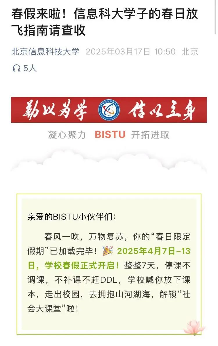 北京信息科技大學近日宣佈,將於4月7日至13日放春假。長達7天的春假裏將“停課不調課、不補課不趕DDL”,鼓勵學生放下課本走出校園,走進大自然或解鎖社會大課堂。