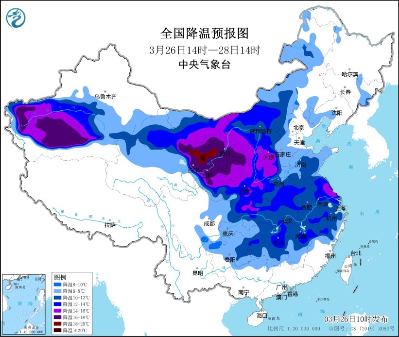受寒潮影響,預計,3月26日14時至3月30日08時,新疆南疆盆地、西北地區北部和東部、內蒙古、黑龍江大部、吉林東部、遼寧東部和西南部、華北、黃淮、江淮、江漢、江南、華南大部以及西南地區東部等地將先後降温8~14℃,其中,內蒙古西部、新疆南疆盆地、青海東部、甘肅大部、寧夏大部、陝西西部、華北西部、江淮東部、江南中北部、貴州中東部等地部分地區降温可達16~18℃,局地降温超過20℃。過程最低氣温將出現在3月29日夜間至30日凌晨,最低温度0℃線將位於華北南部至秦嶺一帶。