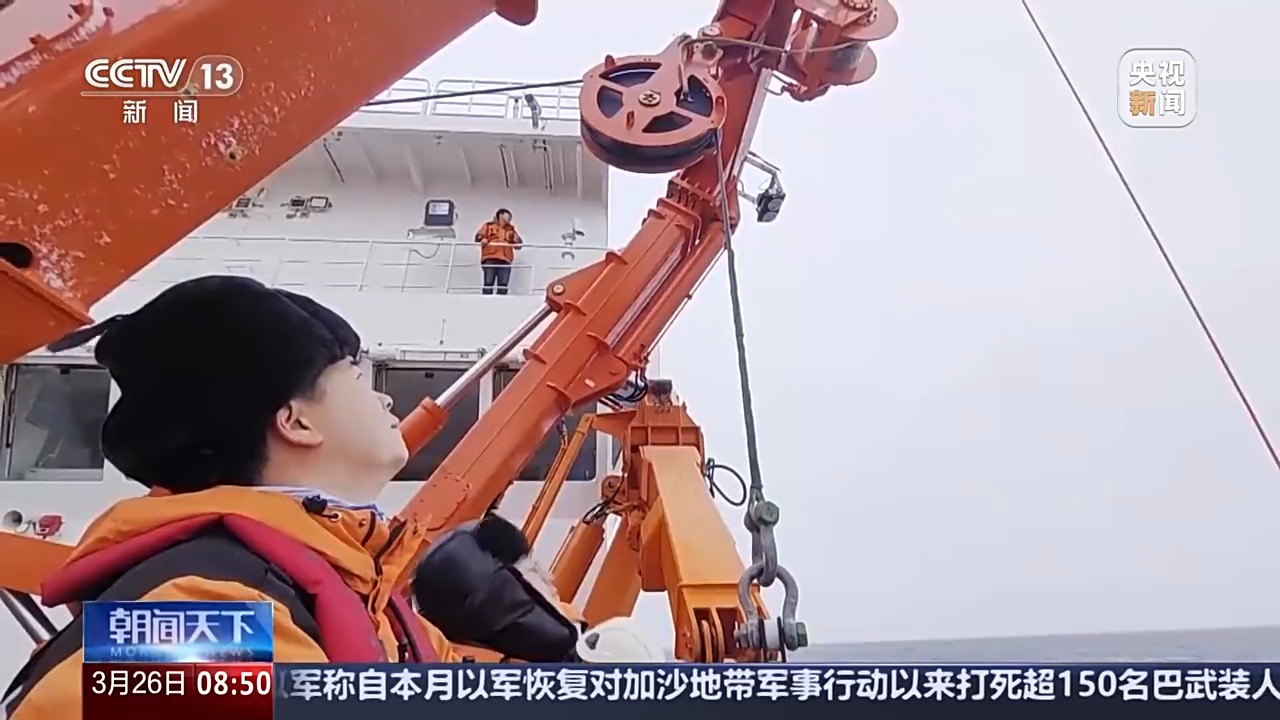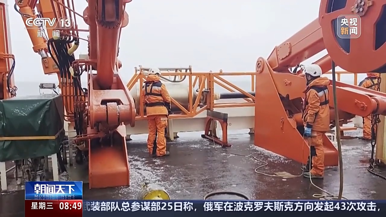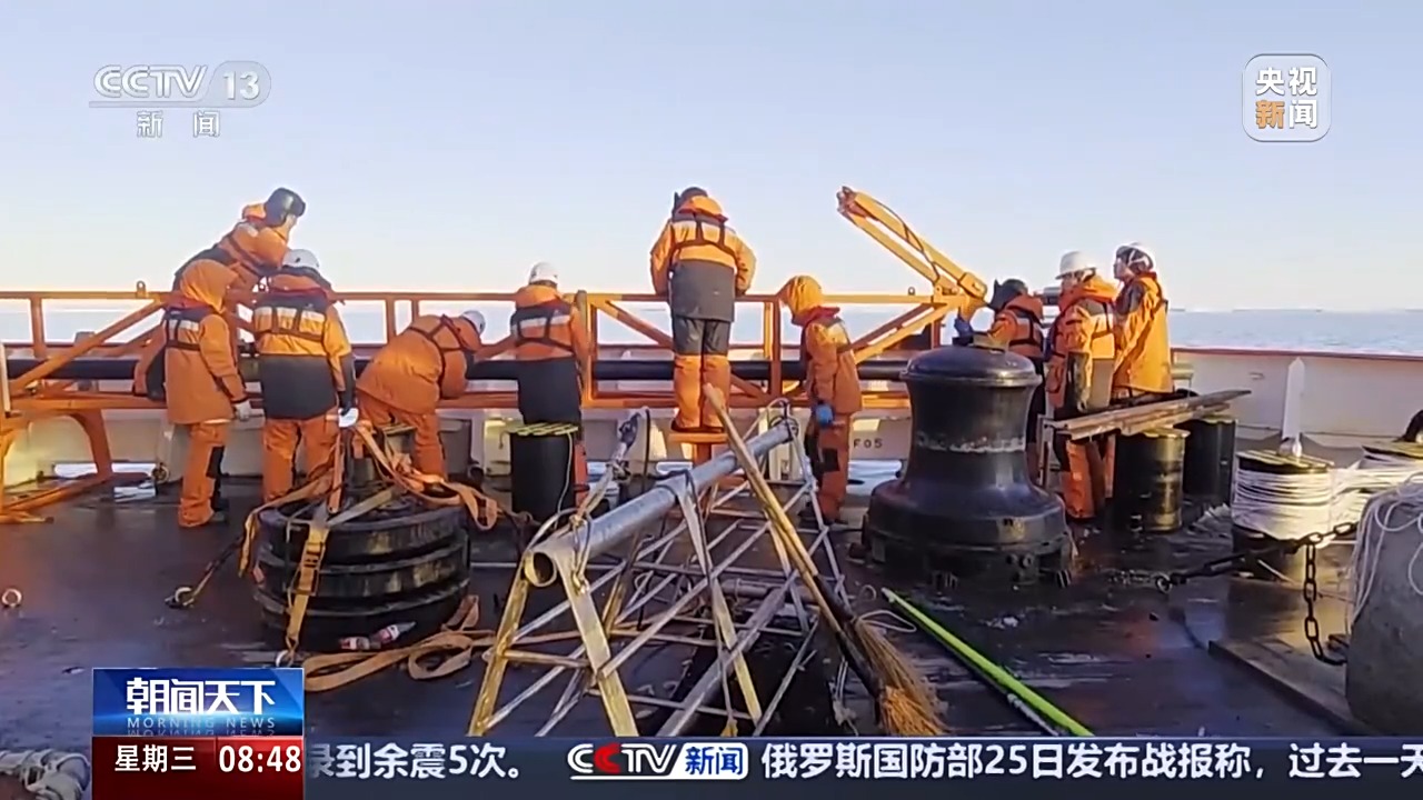 *“雪龍2”號實驗室主任 夏寅月:*我們到底的深度應該在2821米左右,實際放的長度在2840多米,收的時候差不多也是在2840米的時候,開始張力變大。最大達到11.7噸。正常張力,應該在7.4噸左右。