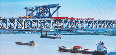圖為全球最大噸位橋面吊機在常泰長江大橋作業。