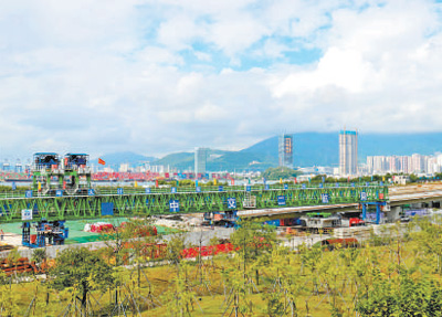 圖為墩梁一體化架橋機在深圳鹽港東立交施工現場作業。