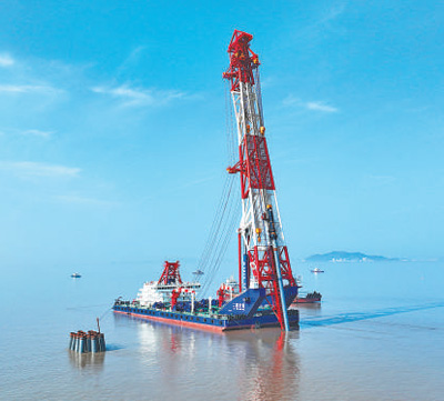全球最大打樁船“二航長青”在杭州灣海域作業。