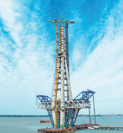 圖為智能築塔機參與深中大橋東索塔施工。