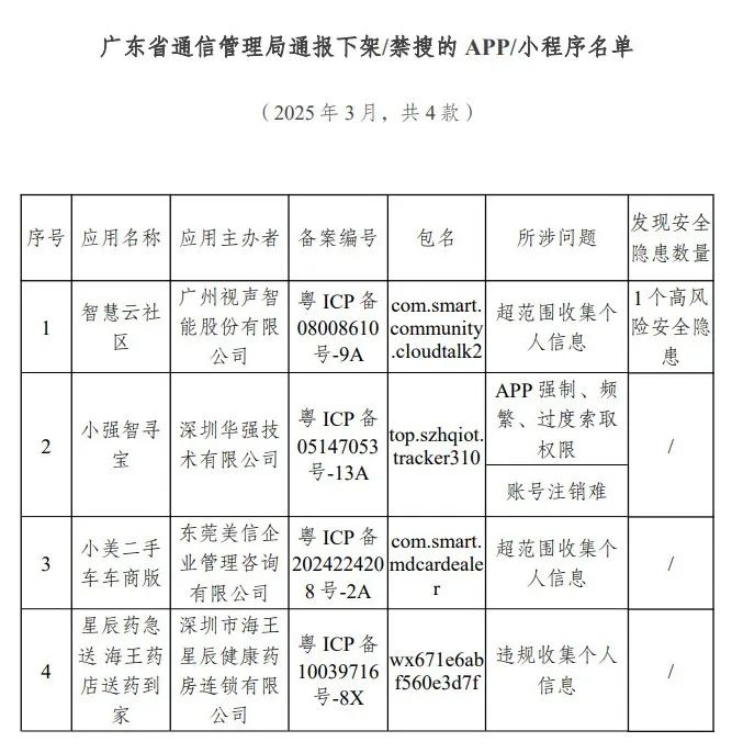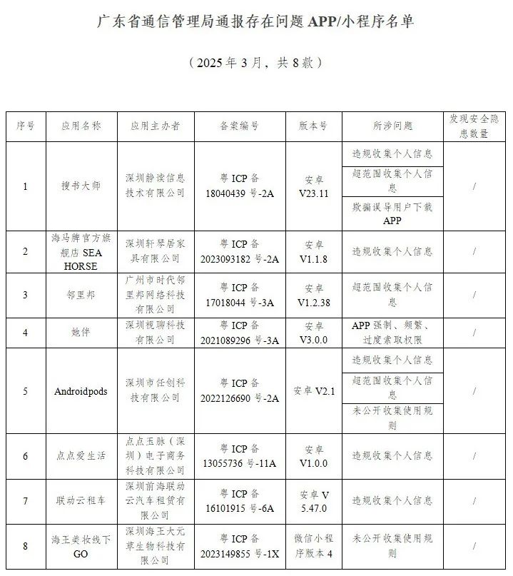 3月25日,廣東省通信管理局通報存在問題的8款APP/小程序名單。全文如下: