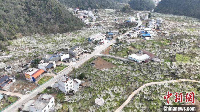 中新網百色3月25日電 (黃元榮 黃文君)近期,廣西百色市凌雲縣2萬多畝李樹進入開花授粉期,潔白如雪的花朵綿延起伏與青山綠水相映成趣,吸引各地遊客紛至沓來。