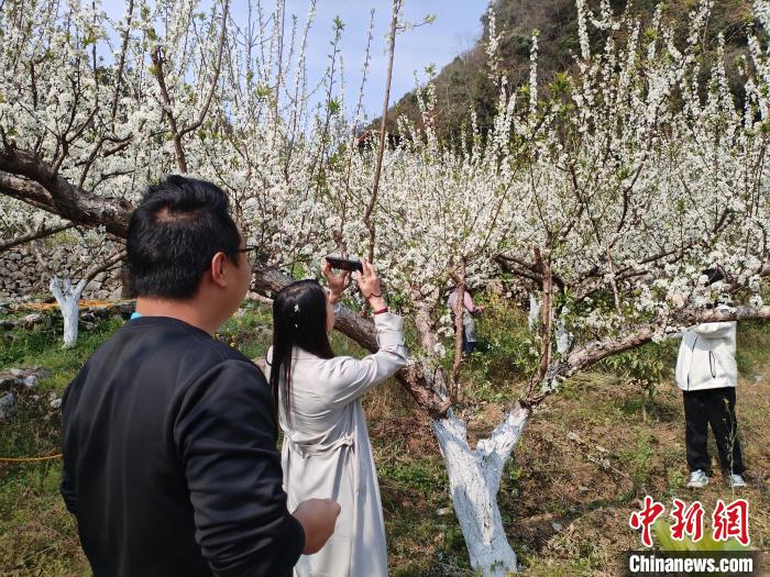 近日,遊客在凌雲縣邏樓鎮歌頂村牛心李基地拍照。黃元榮 攝
