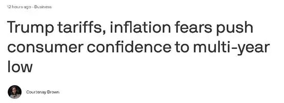 目前,包括Axios新聞網在內的多家媒體在報道此事時,都把關税和通脹在標題上進行了突出。CBS則引用專家觀點稱,如果特朗普政府不能進一步明確關税政策,宏觀經濟層面沒有改善,美國消費者對未來的信心恐怕會持續疲軟。