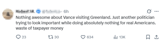 也有人説,“萬斯訪問格陵蘭島沒什麼了不起的。只是又一名實際上對美國人毫無作為的政客,試圖讓自己顯得重要。真是浪費納税人的錢”。↓