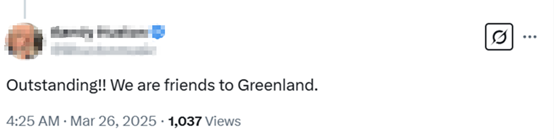 馬斯克當天晚些時候在社交媒體上轉發了萬斯視頻講話的帖子,並評論稱“太棒了”。這些消息引發網友討論,一些網友對此次訪問表示認同,但也有不少人就近期的爭議提醒説,格陵蘭島不希望美方代表團來訪。