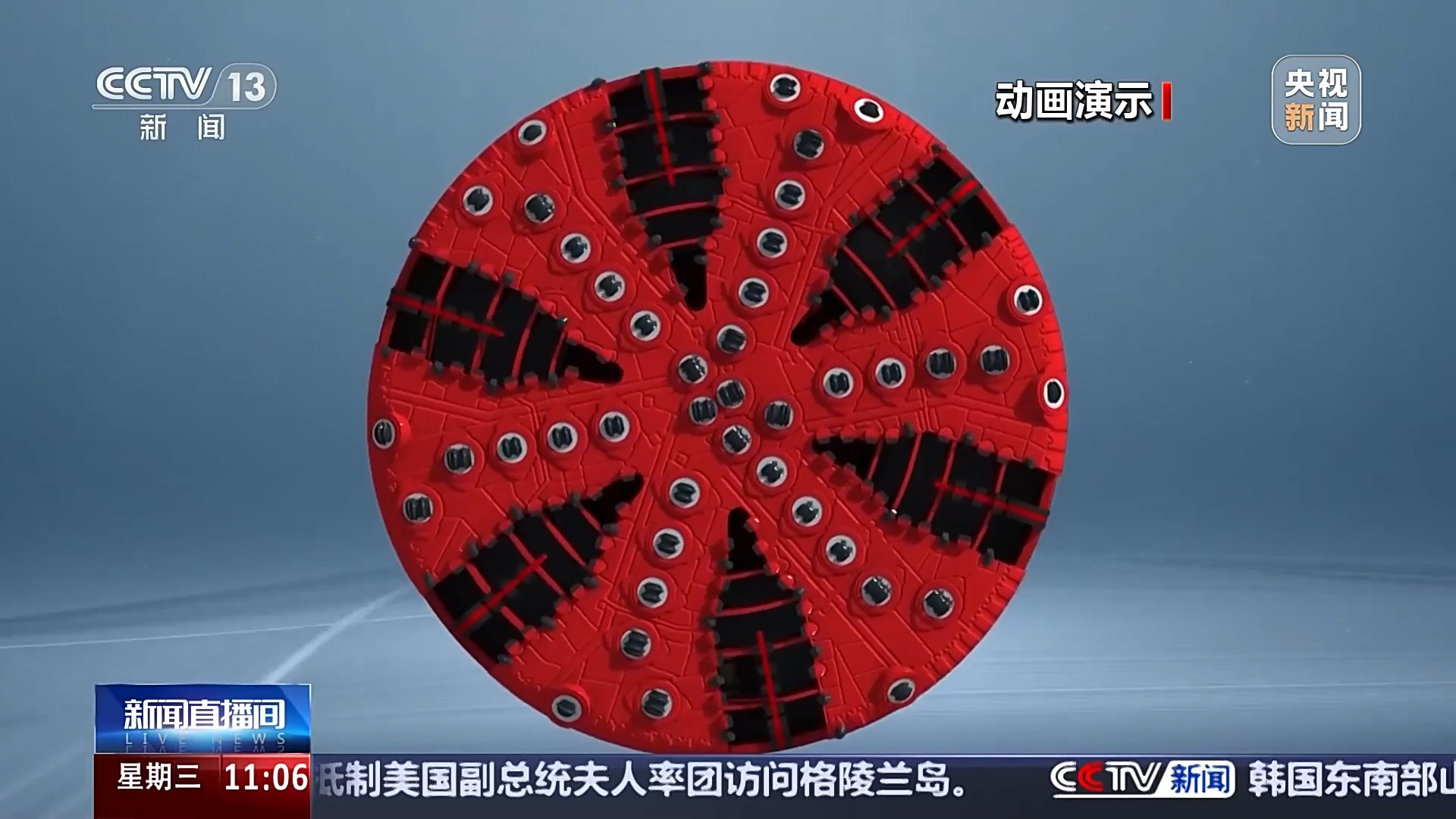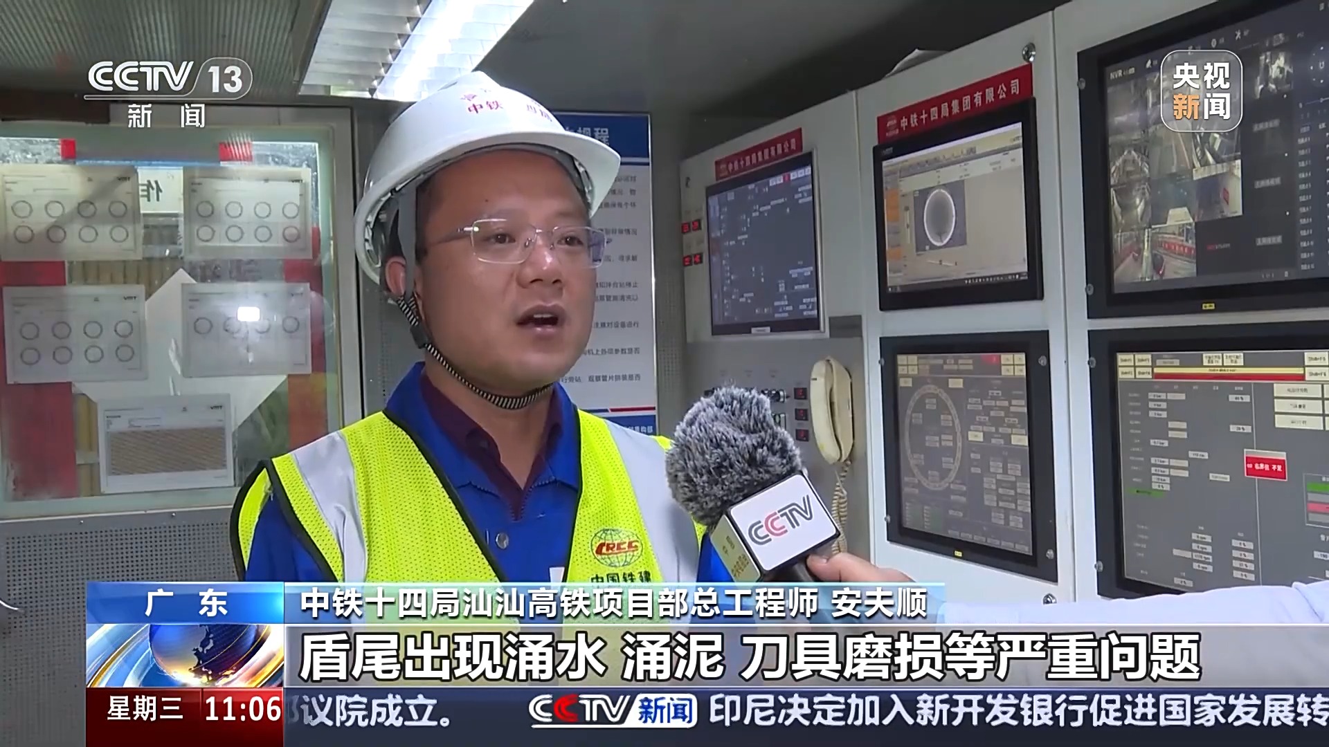 *中鐵十四局汕汕高鐵項目部總工程師安夫順:*在掘進過程中容易出現刀盤卡頓、盾尾出現湧水湧泥、刀具磨損等嚴重問題,而且需要海底頻繁更換刀具甚至帶壓進倉作業。為此,我們首次創新採用刀間距為90毫米的常壓刀盤,刀間距越小,刀具越多,常壓刀盤裏面就增強滾刀在硬巖地層中的破巖效率。