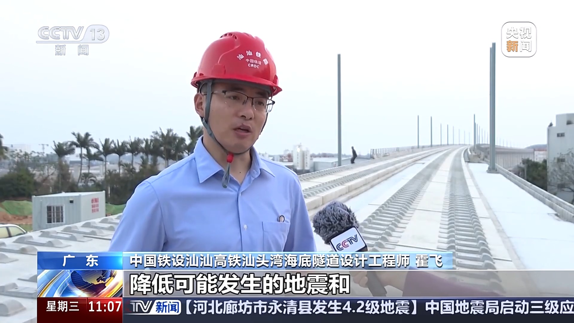 *中國鐵設汕汕高鐵汕頭灣海底隧道設計工程師 霍飛:*對盾構管片的防水墊進行了多次優化,同時,研製出了新型的抗裂材料,降低海水滲漏和隧道開裂腐蝕的風險。