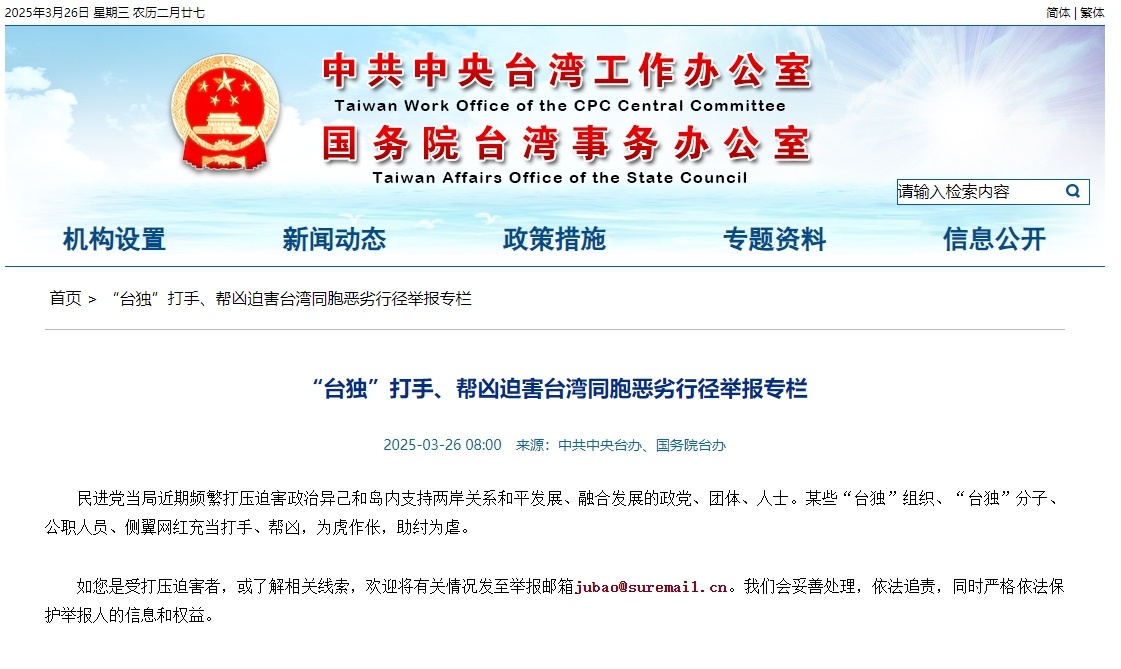 國務院台辦政府網站今天推出“‘台獨’打手、幫兇迫害台灣同胞惡劣行徑舉報專欄”,就是要對上述惡劣行徑和首惡分子進行追責。