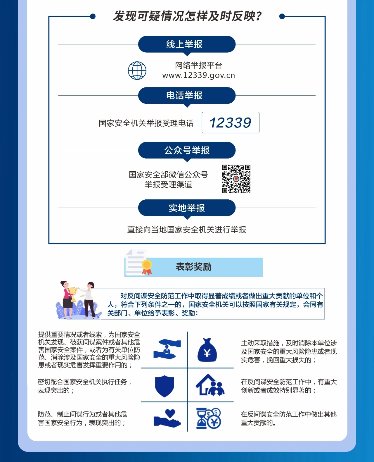 當我們發現有人非法獲取、持有國家秘密;竊取、刺探、收買或者非法提供國家秘密;以“商業合作”名義接受間諜組織及其代理人任務;可疑竊密設備;通過網絡開展竊密、滲透、破壞活動等一切可能危害國家安全的嫌疑人員或行為時,要立即舉報,莫要猶豫。