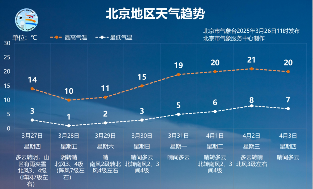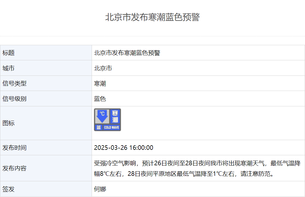 *3月26日16時,北京市發佈寒潮藍色預警。*受強冷空氣影響,預計26日夜間至28日夜間我市將出現寒潮天氣,最低氣温降幅8℃左右,28日夜間平原地區最低氣温降至1℃左右,請注意防範。
