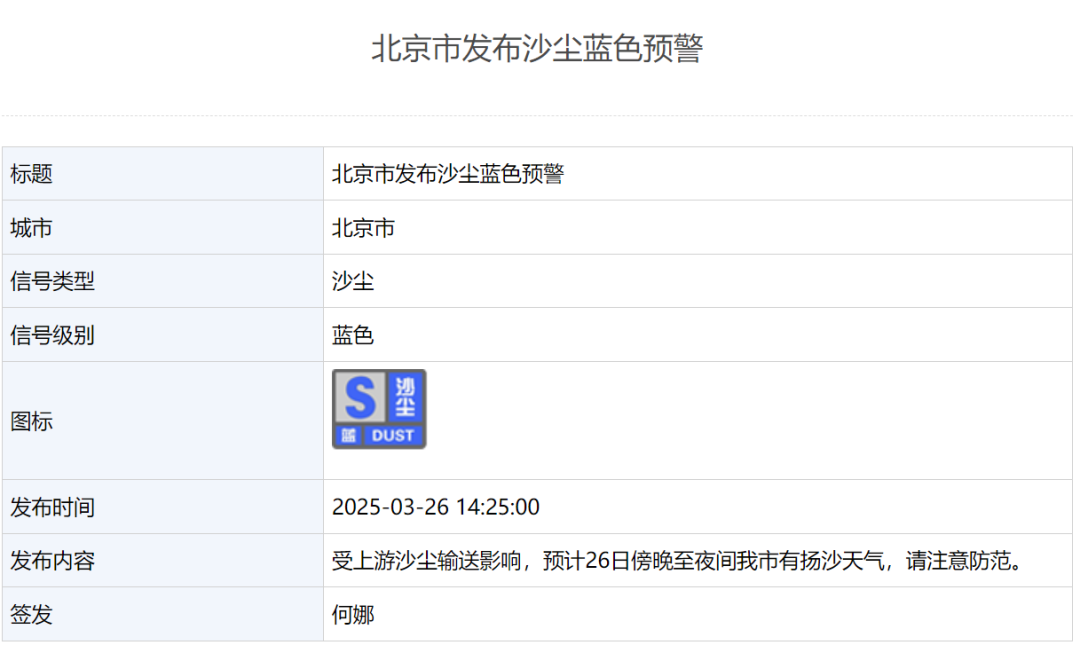 *3月26日14時25分,北京市發佈沙塵藍色預警。*受上游沙塵輸送影響,預計26日傍晚至夜間我市有揚沙天氣,請注意防範。