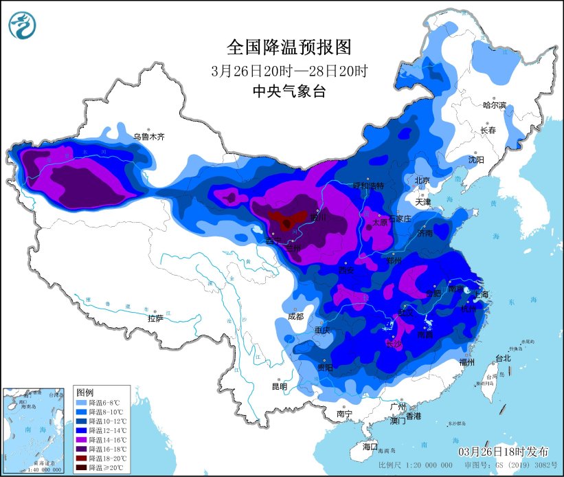 預計,3月26日20時至28日20時,新疆南疆盆地、內蒙古大部、西北地區北部和東部、華北西部、黃淮、江淮、江漢、江南、華南北部以及四川東北部、重慶東北部、貴州東部等地將降温8~10℃,其中,新疆南疆盆地、內蒙古中西部、西北地區北部和東部、華北西部、黃淮西部、江淮、江南中北部、貴州東部等地部分地區降温可達12~16℃,局地超過18℃。