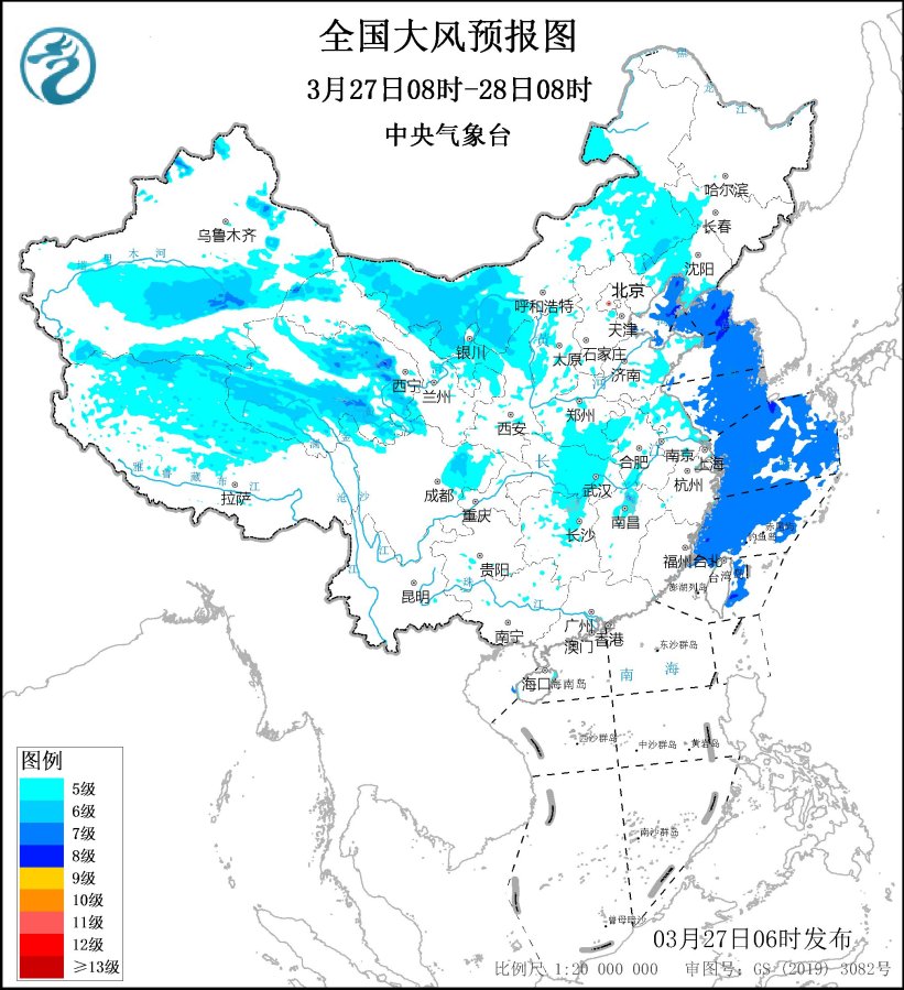 預計,3月27日08時至28日08時,新疆北疆東部和南疆盆地、西藏中北部、青海大部、內蒙古大部、甘肅北部和東部、寧夏大部、陝西北部、山西中北部、河北、北京、天津、遼寧中西部和遼東半島、吉林西部、山東半島、河南、江蘇、安徽、湖北中東部、湖南中北部、江西北部以及四川東北部等地的部分地區有5~6級風、陣風7~9級;渤海、渤海海峽、黃海大部海域、東海大部海域將有7~8級、陣風9~10級的大風。