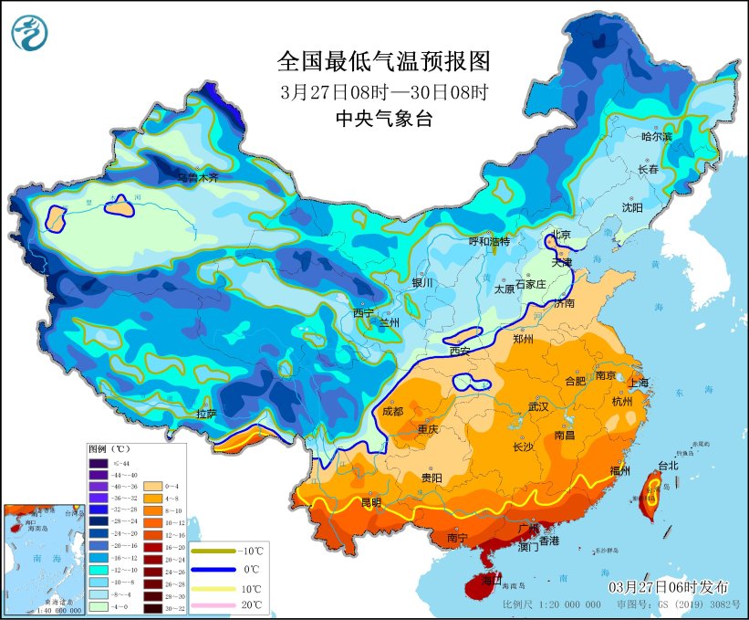 受寒潮影響,預計,3月27日08時至3月30日08時,新疆南疆盆地、西北地區中東部、內蒙古中東部、黑龍江大部、吉林東部、遼寧東部和西南部、華北、黃淮、江淮、江漢、江南、華南大部以及西南地區東部等地將先後降温8~14℃,其中,河南南部和西部、安徽北部和東南部、江淮東部、江南中北部、貴州中東部等地部分地區降温可達16~18℃,局地降温20℃左右。過程最低氣温將出現在3月29日夜間至30日凌晨,最低温度0℃線將位於華北南部至秦嶺一帶。