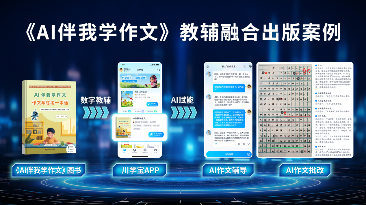 三方合作,充分立足於自身內容和技術優勢,首個合作產品基於川教社出版的《AI 伴我學作文 作文學練考一本通》系列紙質圖書,通過構建智能應用平台,深度融合AI技術賦能教輔內容,使這套傳統作文教輔圖書升級為兼具智能化和個性化的AI作文輔導產品——“AI 伴我學作文”,創新性地實現了AI技術與教輔出版的深度融合,成為業內首個AI教輔融合出版的應用典範。