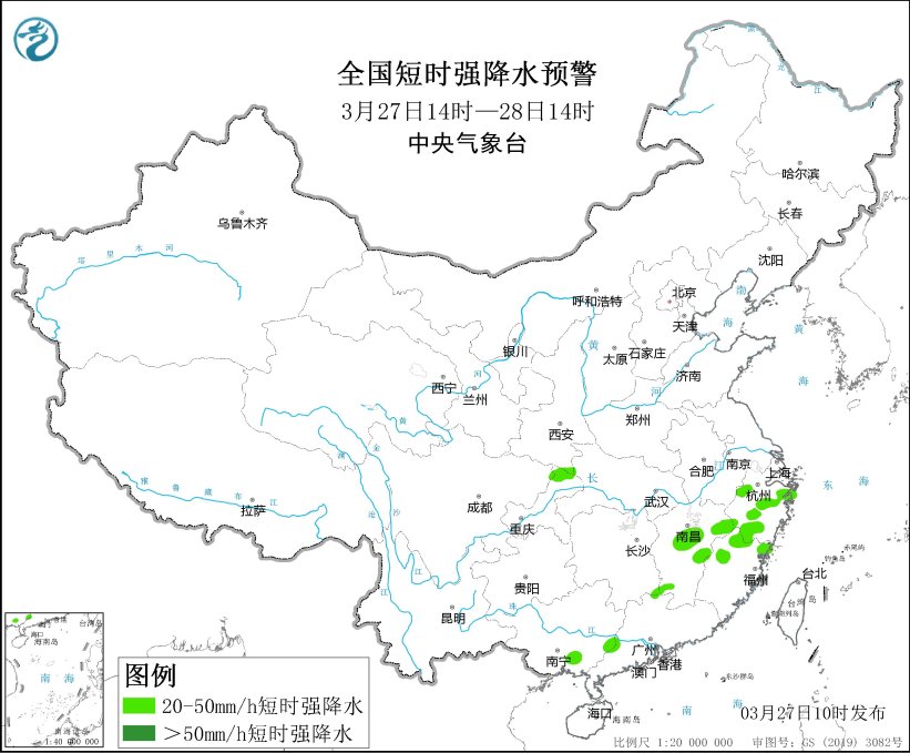 預計3月27日14時至28日14時,安徽南部、浙江南部和東部、江西北部、湖南東南部、福建北部、廣西東南部等地的部分地區將有8級以上雷暴大風或冰雹天氣;浙江、福建北部、江西中部和東北部、湖南東南部、廣西東南部、重慶北部等地的部分地區將有小時雨量大於20毫米的短時強降水天氣。