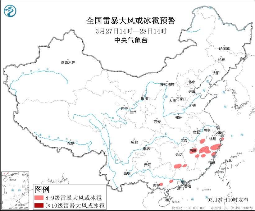 中央氣象台3月27日10時繼續**發佈強對流天氣藍色預警: