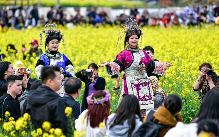 在貴州省榕江縣車江大壩,村民身着民族服裝參加花田走秀(2025年3月16日攝)。新華社記者 楊文斌 攝