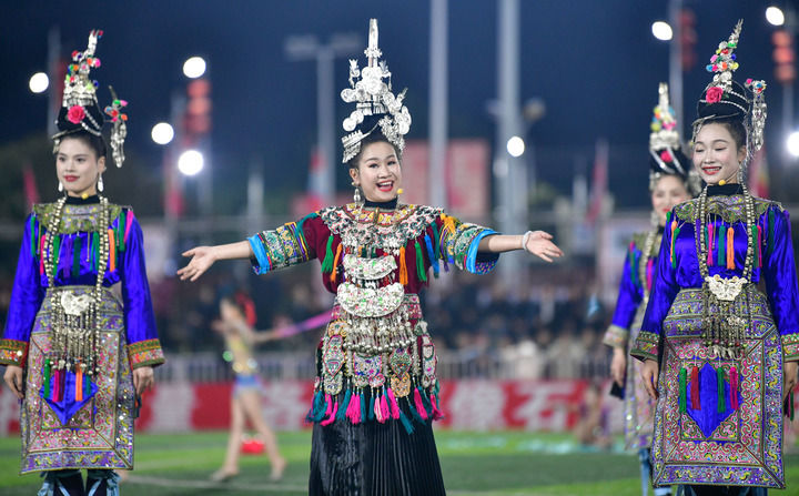 村民在貴州“村超”球場表演民族舞蹈(2025年3月14日攝)。新華社記者 楊文斌 攝